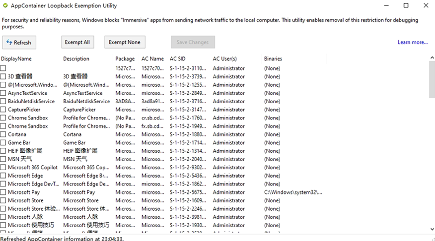 但由于没法接触到系统,有些在系统里面的设置就没法沿用了,譬如网络。UWP 应用没法访问回环地址进而没法通过本机代理上网,比如科学上网。这时候你就需要想办法解除这个限制了。