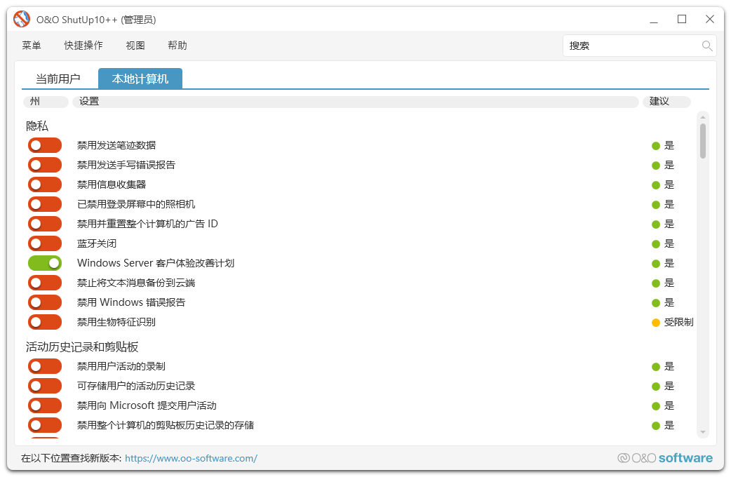 O&O ShutUp10++ 是一个免费适用于 Windows 10 和 11 的隐私(反间谍)设置软件,在 Windows 中系统默认会打开一些手机隐私数据的设置,使用 O&O ShutUp10++ 您可以完全控制这些相关的隐私设置,可以方便的关闭相关隐私收集选项。